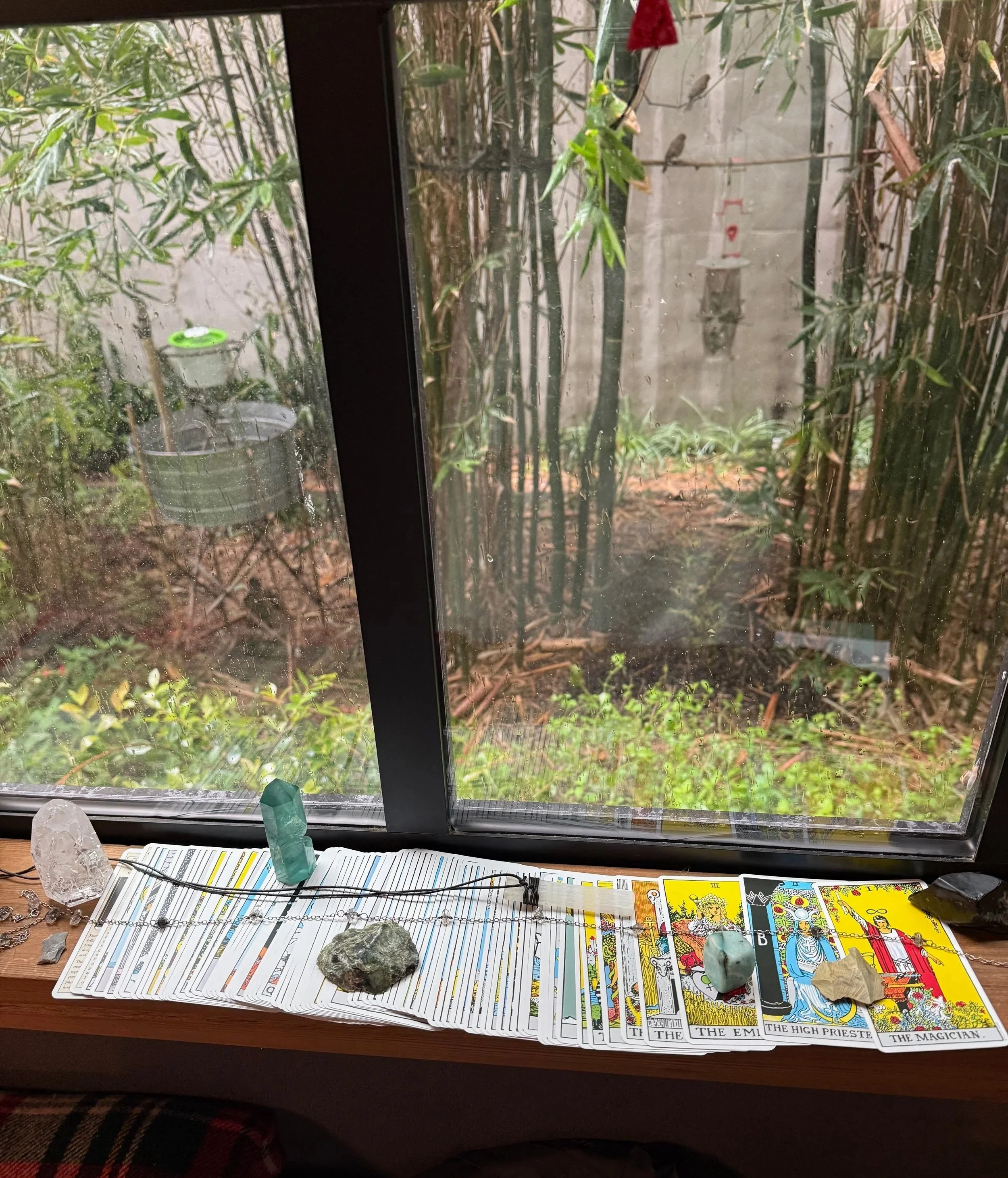 The windowsill in the photo above was built by my partner Jack from a repurposed giant redwood wine fermenting tank — one of those small acts of love that becomes part of a practice without either of you planning it that way. That's where new cards go first. Rain streaks the glass, sunlight moves across the deck through the day, and moonlight finds it at night. Three days of just resting there, held between inside and outside, between my world and whatever the cards carry with them.